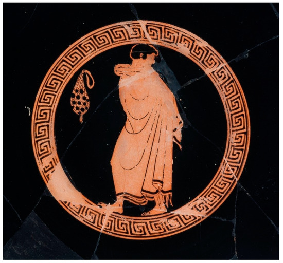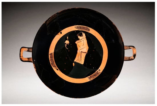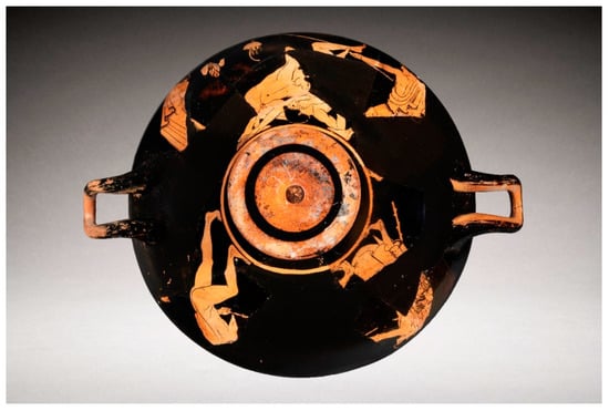 Courting scenes are most often found on vase shapes associated with the symposion, a gathering where men would drink, discuss art and politics, and take part in revelries of varying intensity. Kylikes—wide, shallow drinking cups with handles on each side and a stemmed foot—are especially associated with wine and the symposion and are popular vehicles for pederastic iconography. The interior of a kylix offers a unique presentation, as the image in the interior would only be visible to the drinker who would encounter the scene after he drained his cup and then again and again after each cup of wine. The scenes were experienced in a much more personal and intimate manner than most vase imagery, and most art for that matter. The bowl of the Antiphon Painter cup is 24 cm in diameter. As the drinker holds the cup to his mouth, it envelopes his full field of vision and cuts him off from his physical surroundings. The black field surrounding the tondo image frames and focuses attention on the lone boy and further lends to the beholder’s absorption in the image (Grethlein 2017, p. 191). When the drinker-viewer encounters an erotic image inside his kylix that no one else in the room can see, he can have an individual experience of it, unlike most other aspects of the symposion. As the symposion was fundamentally an all-male institution and the kylix was a shape made specifically for the symposion, it is no surprise that the imagery on these vases was tailored specially to male viewers. Scenes of athletics, war, and other masculine pursuits are also very common on kylikes and other symposion vessels, and scenes of pederastic courting and images of beautiful boys fit into this milieu.