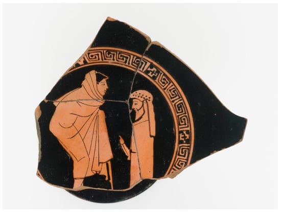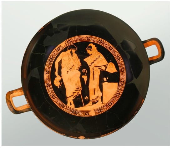 It is often repeated that to be the passive or receptive sexual partner was considered an inherently demeaning position in ancient Greece, and thus not something acceptable for citizen males (Dover 2016, pp. 100–9), though the reality was certainly more complicated (Davidson 2001). Erastês and erômenos are sometimes shown intertwined, with the man fondling his younger partner, but rarely are the images any more explicit (Kilmer 1993, p. 11). In black-figure, there are scenes of intercrural intercourse, and other scenes of erastês and erômenos wrapped within the same cloak, but these iconographic themes are rather rare in red-figure (Dover 2016, pp. 98–99; Kilmer 1997). Like many non-mythological scenes or scenes of “daily life”, heterosexual and homosexual relationships as depicted were likely not consistent with reality. The images tell us more about how Athenians wished to be seen rather than the truth of social life (Shapiro 1992, p. 58; Stewart 1997, p. 157). Vase-painters’ general avoidance of explicit scenes of homosexual sex is likely reflective of the complicated and even problematic nature of pederastic partnerships, rather than a reflection of reality.