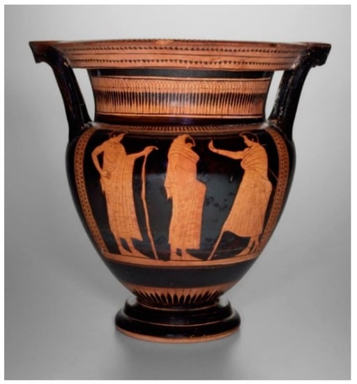 Wrapped youths are also found in non-erotic scenes without overt or implied sexual content. They stand before altars,5 hold offerings,6 and grieve at tombs.7 Women are also often shown wrapped, both while being courted and in non-erotic settings.8 The tight-wrapping cloak is nonetheless an attribute of aidôs in these scenes. Aidôs—a term discussed further below—encompasses ideas of honor and respect appropriate to religious ritual and to women who recognize their place in the social hierarchy (Ferrari 2002, pp. 72–86).