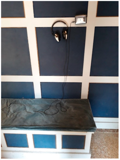For the members of the VSP, arts are crucial to participation in the local socio-cultural life of the city and to their ability to claim civic rights. One of our research participants, a Belgian artist and worker within the domain of education, said: “with an artistic and cultural action they produce something that carries a meaning, that will resonate within a public” (Paul, recorded on 30 November 2017). Indeed, “artistic expressions can help build bridges to facilitate encounters (Vertovec 2007) between populations with different ethnic origins sharing the same city or the same neighbourhood” (Martiniello 2015, p. 1232), and this creates spaces for raising voices. The artistic activities of the VSP involved professional and non-professional artists, migrants and non-migrants, and these activities are considered art items because they were the result of a process of creation (Gell 1998). A series of writing, painting and theatre workshops were the origin of these art products. These workshops were locations for sharing experiences, expertise, thoughts, etc., among people with different stories and profiles, and where people could create art items to communicate these shared contents to those outside of the group. Among these art products were audio-visual creations shown within the framework of a local artistic event. During this festival, the owners of the villas in a middle-class neighborhood of the city of Liege opened the doors of their houses to artists (usually painters) who could then show and sell their works13. The members of the VSP, due to the intervention of a local resident, were able to use an uninhabited villa, owned by an institutional foundation, as the setting for their artistic productions. The first of these, located in the secondary entrance of the villa, was the installation of an audio-tape where one can listen to the life experiences of some members of the VSP (Figure 2).