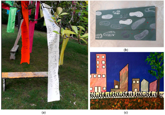 In the garden, a tree was decorated with some “questions without answers” (Figure 3a), such as:“Life becomes for oneself as a globe that turns around itself. In this world, everyone must live without obstructing the life of the others. In this world, there are so many people that live in an incredible precariousness, and all this is caused by the others’ wickedness. In this world, and more precisely in Belgium, there exist people, migrants, men, women, children, in illegal situation, called sans-papiers, that struggle to find a vital space”.(Idem.)