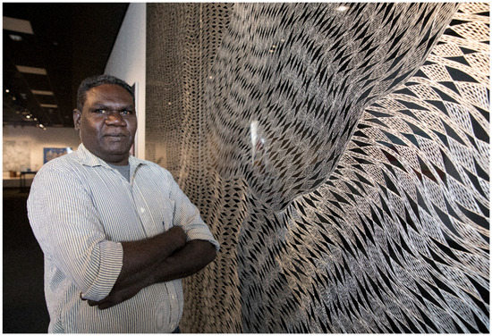 - QAGOMA. 2018. Gunybi Ganambarr; Brisbane: Queensland Art Gallery and Gallery of Modern Art. Available online: https://www.qagoma.qld.gov.au/whats-on/exhibitions/apt8/artists/gunybi-ganambarr (accessed on 13 November 2018).