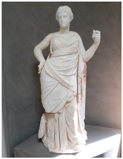 The polyvalence of Leda in dining room g, as both a mythological figure and a “statue,” allowed a viewer to connect it to the older, Hellenistic-era decorative elements within the house. If a viewer considered the image of Leda and the swan as a painted allusion to a statue, it became a two-dimensional pendant to the Hellenistic-era female stone sculptures in the peristyle outside the dining room’s door. In other words, the image of Leda invited comparison between it and its two material counterparts.37 The discovery of more than one statue within a domestic context in Sicily is a rare occurrence. The two statues from the House of Leda, now preserved in Soluntum’s archaeological museum, are thus distinct. The first sculpture represents a woman wearing a tunic with a draped mantle and dates to the second century BCE (see Figure 3). It finds its closest parallels in the Small Herculaneum Woman sculptural type, named after the town in which excavators uncovered the first and best-known version of this statue.38 The second sculpture, roughly contemporary with the first, depicts a Muse and is carved from white marble that was imported into Sicily from the Greek islands, most likely Paros (see Figure 4) (Marconi 2013, p. 159). Greek marble was an expensive commodity, and owning a large sculpture of this material was a statement of wealth in and of itself. The Muse stands with her weight on her right foot and the left leg slightly bent at the knee as revealed by the drapery. Her left elbow rests on a plinth or column with the arm bent outwards and her hand enclosed around a now-missing object, which would have been a scroll, the primary attribute of Clio (the Muse of history).39