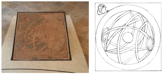 The shared medium (or representation) of stone resulted, for the viewer, in a unified ensemble between the newer and older decorative elements at the House of Leda. The homeowner intentionally left part of the house’s Hellenistic-era décor in place while simultaneously updating the dining room (among others) with Fourth-Style wall paintings. Why did he choose to renovate some aspects of his house but preserve others? One pavement within the House of Leda, an armillary sphere mosaic from room f, offers insight into this phenomenon (see Figure 5). The mosaic dates to the original construction of the house in the second to early-first century BCE. It depicts a red sphere with grey rings, and at one corner there is the small face of a young boy, said to be the personification of a Wind (De Vos 1975, p. 198). The mosaic represents an armillary sphere, an instrument used to calculate the distance between celestial bodies.54 This device is most thoroughly described by the writer, scholar, and astronomer Ptolemy, who lived in Egypt in the second century CE. In his Geography, Ptolemy attributes the invention of the armillary sphere to the Greek astronomer Hipparchus of Nicaea, who lived in the second century BCE. In the Hellenistic period astronomy enjoyed great prestige as a subject of study. Astronomical instruments and models were found in the major Hellenistic cities of the Mediterranean, including Syracuse, the center of Sicilian culture in the second century BCE (ibid.).