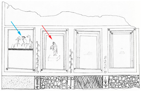Soluntum, House of Leda, northern wall of triclinium g, Castor and Pollux (blue) and Leda and the Swan (red), schematic drawing (after De Vos 1975, p. 217).