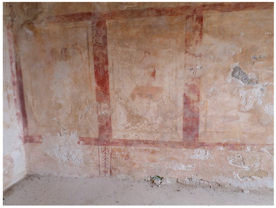 Soluntum, House of Leda, northern wall of triclinium g depicting the Dioscouri (left) and Leda with the Swan (center) (photo by the author).