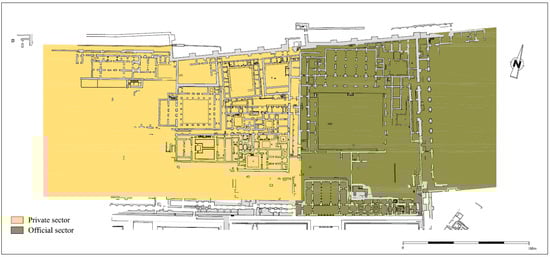 In the Western House (No. 11, Figure 13 and Figure 14), the absence of any unique architectural element, such as an oven, makes it difficult to determine its exact function; it has been hypothetically associated with the serving of drinks at the table, given the large amount of glass found in the drainage channels that ran below it (Vallejo Triano 2010, p. 476). In this dwelling, what we consider to be the area of the “head of a palace department” adopts another morphology, as it is the bedroom–latrine combination of the western corridor that suggests it was the residence of the functionary in charge of supervising the work of multiple palace servants. The latter used a communal latrine in its southeastern corner.