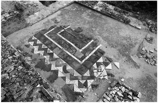 Judging by its location on the highest part of the Qaṣr and the city and its designation of Dār al-Mulk Ibn (Ḥayyān 1967, p. 99), the intimate residence of the Caliph cAbd al-Raḥmān III represented “the public image of the power”12 (Meouak 1999, p. 38) (Figure 3). In that location it was the visual reference of the metropolis and the pinnacle of the political and social hierarchy. As such, the importance of the rest of the Qaṣr’s residents was shown by how close they were to it (Vallejo Triano 2010, p. 502). The complex was excavated in 1911 and was tentatively identified as the caliphal residence by Velázquez Bosco (1923, pp. 13–14). This was confirmed by subsequent research that dealt with singular aspects, including the importance and symbolism of the location, its opening to the exterior via a terrace-lookout point (something formerly unseen in palace residences), its role as the initial point for the construction of the Alcazar and the characteristics of its ornamental programme (Hernández Giménez 1985, pp. 44–46, 72–75; Manzano Martos 1995, pp. 328–29; Vallejo Triano 2010, pp. 460, 467, 501).