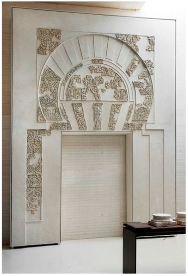 The decorative programme in stone with plant, geometric and epigraphic motifs is also singular. It is focused on the tripartite apertures in the main rooms and on the interior door of the northern room (Figure 6). The former, which are lintelled apertures, were extradosed with decorative horseshoe arches, a solution normally reserved for the main gates of cities and official fortresses,18 as well as the Córdoba mosque. Their presence endows this building with a particular symbolism as, in both the emirate and the caliphate, the horseshoe arch—decorative or real—became an “honorific, emblematic and representational” element that “necessarily formed part of the visual lexicon associated with the State” (Vallejo Triano 2010, pp. 395–96, Figure 46). The acanthus and the palmette were the most common choices for decorative plant motifs; the latter, which had special significance for the Umayyad dynasty, underwent multiple morphological developments from that time on.19