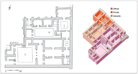 There are several dwellings that, due to their structure, materials and location—in many cases adjoining some of the grand palaces we have previously analysed—have been identified as seats of these palace department headquarters and, at the same time, as servants’ working spaces (Vallejo Triano 1990, p. 131) (Figure 13). There are basically two architectural and spatial markers that denote these headquarters. The first is the distribution of the rooms and their materials that allow us to differentiate between the residential area of the person in charge of the activity and that of those who carry it out. Thus, although these are organised around a courtyard, their architectural layout does not correspond to the typical structure of a residence designed for a family unit, where there is no clear hierarchy of rooms other than that of a functional specialisation (Gutiérrez Lloret 2015, pp. 25, 29–30). Another indicator is the association of the bedroom with a latrine for the specific use of the head person, even though there are other latrines open to the courtyard for the rest of the workers and/or occupants of the residence. This bedroom–latrine combination is always linked to important personages. Through these two indicators we can see relationships of dominance, dependence or subordination of some rooms with respect to others (Figure 14).