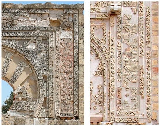 House of the Pool (left) and House of Jacfar (right). Frames with geometric decoration. (© Conjunto Arqueológico de Madinat al-Zahra).