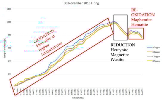 A graphic representation of the single three-phase firing sequence and some of the associated iron oxides as suggested in the scientific literature. This graph resulted from data gathered in a November 2016 test firing.