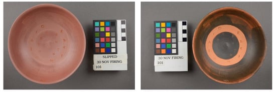 As the firing begins, all the pots inside the kiln are red, including images and inscriptions that have been painted using slip and the slip/pigment mixture, respectively. As the heat rises, the kiln is filled with oxygen and all of the surfaces (including the slipped and inscribed areas) of the vessels became brighter shades of red and orange in this “oxidation” phase. The iron compounds produced during the higher temperatures of this oxidation phase are primarily hematite. After reaching an optimal temperature29, an organic substance—thought to perhaps be wet wood or in our case, olive pits and damp hedge clippings—is introduced into the firebox and any ports that allow oxygen into the kiln are closed up. This immediately induces a smoky environment inside the kiln as the fire is choked from a lack of oxygen, beginning the “reduction” phase. On the graph, this short phase begins at 1000 degrees and falls quickly to a low of 800 degrees, as the temperature inside the kiln plummets due to a lack of oxygen. During this phase, all of the ceramic surfaces turn black due to the formation of black iron compounds. Importantly, a thin layer of glass forms over only the slipped areas of the ceramics (; , ; ); this layer not only provides the sheen seen on these areas when the firing is completed but also plays an important role in the subsequent “re-oxidation” phase. In this final phase, the firebox and chimney are re-opened, the reduction fuel is raked out, and new fuel is introduced as oxygen re-enters the kiln. Oxygen also diffuses into the unslipped surfaces of the pots, turning them from black to the iron reds maghemite and hematite. However, the slipped surfaces, that is, the black surfaces covered with a thin layer of glass, do not return to red as oxygen cannot diffuse through this vitreous layer. The painted inscriptions turn a combination of reddish-brown and purple as they were painted with a combination of slip and pigment. After a brief re-oxidation phase, the firebox of the kiln is closed up and the kiln allowed to cool over the course of approximately 48 h.30 An image of the wares produced in the November 2016 firing is shown in Figure 5. Figure 6 shows a cup before and after firing, with the added inscription “oxidation reduction.” It is therefore the mixtures of iron compounds on ceramics surfaces (and the presence of vitreous or non-vitreous surfaces created through painting and its firing) that produces the multi-colored effect we see on the finished objects.