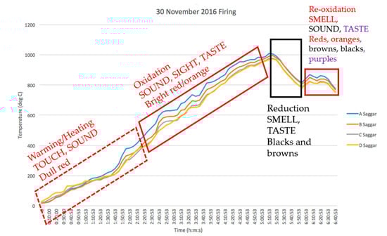 Thus far, I have described color as chemically-bound but the remainder of this paper will consider what ancient kiln attendants might have experienced sensorially as they progressed through the “critical zones” of the firing that produced the colors they desired. The success of a firing and indeed the viability of a ceramics shop depended on an acute awareness of these sensory cues. Many of these cues are fleeting, requiring all the more attunement to events such as a brief change in the fire’s smell and its triggering of taste sensations, the appearance and disappearance of a whooshing flame or the sudden and short-lived sounds inside the kiln. Becoming aware of these moments forces a recognition of “the collective significance of the senses as modes of communication and information” (), something all the more critical when potentially saleable pots were obscured from view inside the kiln. While the sense of sight was crucial to the firing process, I wish to emphasize that the firing is a very sensory-intense experience requiring all of the senses to work in concert. Furthermore, I suggest that certain senses are heightened at particular stages of the firing and are therefore more directly associated with the production of certain colors. Based on experimental observations, I propose a sensory four-phase firing, in combination with a chemical three-phase firing (Figure 7). This four-phase firing includes: a warming/heating phase when touch and sound are essential and all vessels are a dull red; an oxidation phase when sound and sight are most relevant and the vessels are the bright red more associated with hematite; a reduction phase when smell and possibly taste are important for the production of the iron blacks and browns such as magnetite and hercynite; and a final re-oxidation phase when smell, taste and sound are associated with the production of a mixture of iron-oxidation compounds that are red, orange, brown, black and purple.