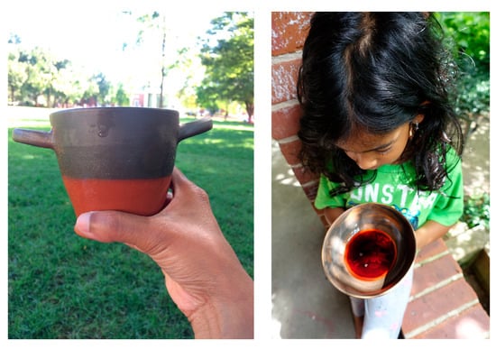 (Left) “Sweating” skyphos filled with water. (Right) Changes in the color of the vessel in sunlight and when filled with cherry juice.