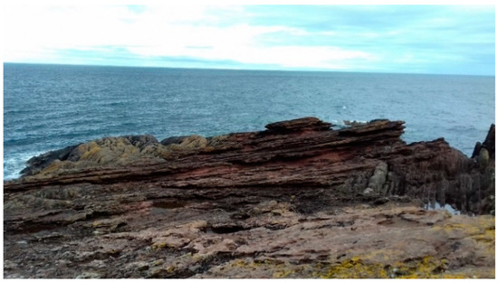 The Unconformity makes this event visible through the ‘small pleats’ (Hawkes 1951, p. 48) or vertical folds that do not correspond to our usual expectation for geological strata to be built up and laid down in horizontal layers (Figure 6). It is ‘unconforming’ in that time is not present as a sequential and continuous narrative. The storyline is broken. The vertical, folded rocks that were once mountains have eroded and, in the process, erased 65 million years between themselves and the more recent horizontal sandstone strata. The geological story is revealed in its incompleteness—in the ‘gap’. Time is seemingly not set in stone. The Inchbonny site is most often represented through the 1787 engraving by the Scottish merchant, artist and geologist John Clerk of Eldin. The site today is overgrown and almost invisible, the horse and carriages replaced by the cars, trucks and bikes travelling along the A68.