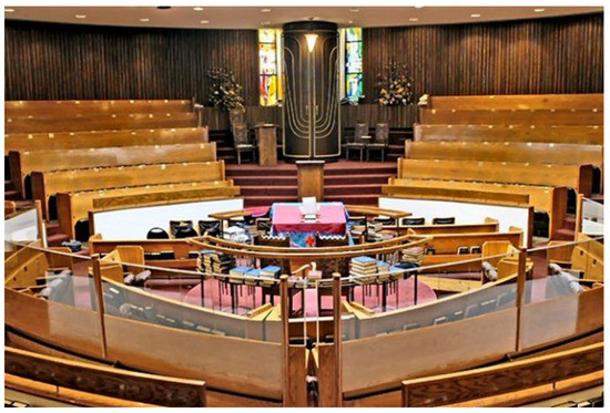 The wood-lined circular interior sanctuary was divided by a mechitza, a barrier separating men from women. The seats were arranged in banked pews. It was nevertheless possible for men and women to see each other. Congregants faced the bima at the south; a hexagonal skylight rose above it. Twelve long, narrow windows contained stained glass that represented the twelve tribes of Israel (Figure 2).