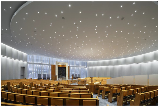 The room is colored in soft and restful tones, with pale hues bringing warmth, and cool colors creating calm balance. Gentle indirect lighting from two recesses around the sanctuary walls provides good illumination that can be modified (Figure 8). The ceiling is a soft blue, reminiscent of the sky, and concave to evoke the sky over the most ancient Biblical site of prayer; it may also refer to that color in the Torah. The walls are made of wood, washed in a pale gray-blue. The light-filled sanctuary space, including natural light from a tall window behind the ark, is both beautiful and important to the congregation. Near the door on one side, perforation holes assist the acoustics; the acoustical engineers originally wanted more of them but the architects did not. The custom-designed carpet in tones of blue is well maintained in the sanctuary but less so in the surrounding corridor, revealing the problems that arise after a building has been in use for some time. This quiet sanctuary is given a perhaps jarring note by the heavy ark and the chairs flanking it, designed at the building committee’s insistence by a firm that specializes in these installations; the company is known for using Jerusalem stone in its products. The furniture around the bima is too heavy to move for the wedding canopy to be affixed most attractively. Although these elements are inconsistent with the otherwise integrated design, the spirituality of the sanctuary remains undisturbed. The congregation and architects did not install murals, colored glass, or inscriptions.