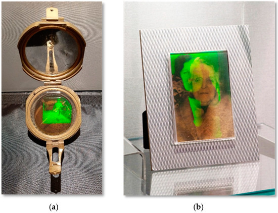 The results below include a description of the artworks produced, and the results of the evaluation of the works by the critique groups with a focus on the last critique. Photographs of the animated three- and four-dimensional images are shown below for illustrative purposes only as it is very difficult to visualize these artworks in two dimensions. Figure 1a,b are of the monochromatic analogue shadowgrams. Figure 1a Great Great Grandfather depicts a holographic image of a man, contained within an antique compass, striding along with a walking stick. The image looks to have been taken in the 1940s. The transparent holographic film on which the image is produced is placed on top of the glass protecting the compass needle which is clearly visible beneath it. The image of the walker appears to be sunk beneath the glass existing in the same space as the compass needle. Figure 2b depicts two portraits of the same woman 50 years apart. A transparent hologram of a photographic portrait taken in the 1940s sits on top of a digital photographic portrait. The earlier holographic portrait is sunk beneath the surface of the later photograph.