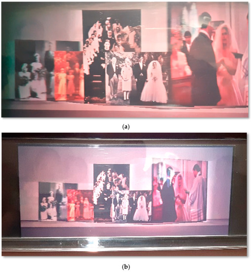 Passing Time, Distant Memory shown below in Figure 2a,b was created during the very last phase of the study and critiqued by the art and holography experts only. The digital animated hologram was hung and lit as part of the exhibition in City Art Gallery, Aveiro, Portugal. As the viewer moves laterally in front of the hologram from left to right, the photographs swing in an arc to show spaces and distances between them; the images on the left become obscured by those on the right-hand-side as if the photographs were solid. The images farthest from the viewer on the left-hand-side of the image depicted older photographs and these were sunk deeper within the Z-axis of holographic space. The image, an animated video on the far right-hand side was the most recent. Seven seconds of footage taken from a wedding video were edited to produce an animation in which the bride is shown to speak and laugh as the viewer moves. The video sits on a virtual surface which projects in front of the image plane of the hologram, protruding into the viewer’s space.
