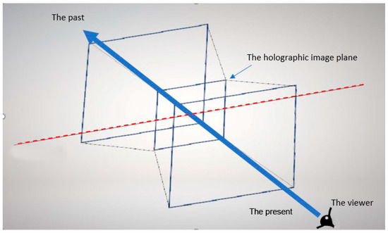 This section analyzes both the artworks produced, and the silent researcher critique method used to evaluate audience experience of the artworks. The holograms all used the Z-axis of holographic space to depict different time periods. Images were sunk into the depth of holographic space to show a period further back in time as illustrated in Figure 3 overleaf. The dotted red line depicts the present moment, the space behind the holographic image plane depicts the past and the space between the plane and the viewer depicts the present.