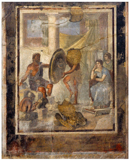 Such ekphrastic exchanges revolve around a confrontation with the other. Even as texts “encounter their own semiotic others” (Mitchell 1994, p. 156), in the House of the Gilded Cupids, the viewer confronts herself as other. Here, Thetis looks upon, not the river Ocean and scenes of war and peace, but upon a gleaming surface, a rarity within the corpus of such compositions, appearing in only two other Pompeian houses (Taylor 2008, p. 153). While in examples such as that from house IX.1.7 in Pompeii, Thetis’s reflection is clearly visible (Figure 5), in the House of the Gilded Cupids, her projected form is more amorphous. While fragmentary, the extant portion of Thetis’s figure suggests that her right hand rests against her face, perhaps in a gesture of contemplation common in such images. Similarly, her body turns to suggest that her gaze is fixed upon the shield (Figure 4). Given the lack of ornamentation on the shield itself, it is likely that the polished surface would be understood as a reflective one, with the pale blue wash upon the edge of the shield perhaps referencing the form of Thetis. Even without a clearly depicted reflection, the smooth surface of the shield shifts the interpretive emphasis from the armor to Thetis. Rather than highlighting the virtuosity of a verbal, visual, or material craftsperson, this shield provides Thetis with the opportunity to confront herself.