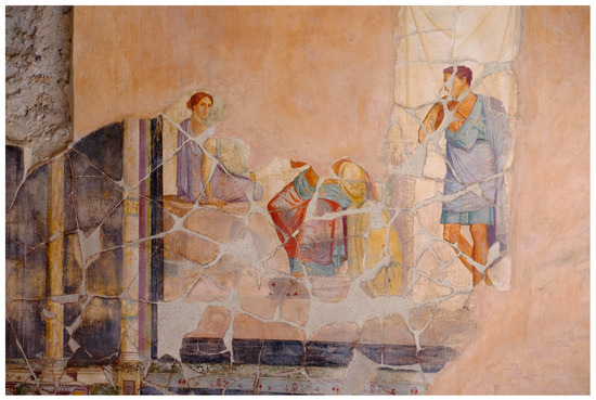 Like the painting of Thetis, this depiction highlights interplays between viewer and viewed, utilizing the surface of the shield as a tool that, like a mirror, allows for the externalization of the form of the viewer. Such visual connections may be underscored by the identifications of the figures. Unlike the depiction of Thetis and Hephaestus on the north wall, the identification of these figures is less certain. Both Antonio Sogliano and Florian Seiler associate the seated woman with Briseis, the war captive at the heart of conflict between Achilles and Agamemnon (Sogliano 1908, pp. 31–32; Seiler 1992, p. 111; Powers 2006, p. 121). The potential identities of her male companions have been variously identified as a seated Agamemnon and contemplative Achilles or as a seated Achilles and a contemplative Patroclus (Newby 2016, pp. 175–76). Such difficulties need not impede interpretation; indeed, as Bettina Bergmann has noted, formal parallels do much to underscore thematic connections (Bergmann 1994, p. 245). Viewers familiar with the range of intersecting stories associated with Thetis and Briseis might take the repeated shield as a conceptual jumping off point.