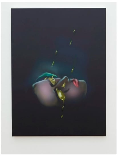 Gagliardi’s work (e.g., Figure 2) challenges the construction of an image, and of our society, in the digital age. Her work uses digital media as a tool of production, exhibition and distribution. Despite looking like traditional paintings, they are digitally printed with materials more akin to the advertising industry and set up a dialectical relationship with the history of painting. She uses a freehand digital illustration tool to ‘paint’ images, printing them onto PVC and then adding hand painted elements such as brush stroke marks using varnish and nail varnish to add to the simulacrum of traditional painting. ‘As a whole, the appearance of her pieces is caught in a state between human and machine, reflecting the confused, surreal tone of much of the images and world’s she portrays’ ().