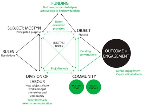 Applying cultural-historical activity theory (CHAT) (), Harding created an organisational activity map (Figure 3) to understand the context and origination of MOSTYN’s identified issues and their dialectical relationships. CHAT theory espouses that consciousness is essentially subjective and shaped by the history of each individual’s social and cultural experience and that “the events that occur during the activity and the consequences of the activity can qualitatively change the participant, his/her object and motives for participation, the social environment of the activity and the activity itself” (; Rogoff 1995 cited in ). As Kaptelinin identifies, such an approach helps researchers “to ask right questions-rather than providing ready-made answers” (Kaptelinin 2005 cited in ).
