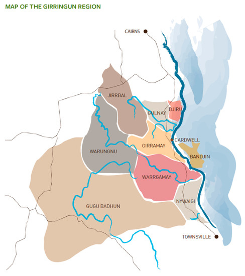 Map of Girringun Traditional Homelands on the north eastern Australian coastline, showing the nine language groups that constitute Girringun’s Traditional Homelands (Reeves and Higgins 2018). Reproduction courtesy of Girringun Aboriginal Art Centre.