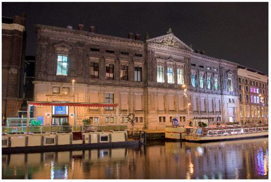 The Allard Pierson Museum by night, seen from across the Rokin canal in December 2015. [Image credit: CC BY-SA 4.0].