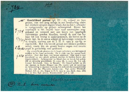 If the Girl with the Golden Wreath should indeed be placed within this context, its dating might have to be reconsidered. Indeed, in the first Scheurleer catalogue (1909) the portrait was dated to the Flavian period (69–96 ce) on the basis of the girl’s hair-style and jewelry (Figure 3) (Cf. Edgar 1905; Doxiadis 1995, pp. 234–35; Borg 1996, pp. 71–73). By the time of the first Allard Pierson Museum catalogue (Allard Pierson Museum 1937), the portrait had been re-dated for unknown reasons to the reign of Claudius (41–54 ce) or Nero (54–68 ce) (Figure 4).26 If correct, that would make the Girl with the Golden Wreath the earliest Fayum portrait in a Dutch collection, and one of the earlier examples generally. It has since been re-dated to ca. 50–75 ce, (Scheurleer 2009, p. 66) or more broadly ca. 50–100 ce. (Van Oppen in Hupperetz et al. 2014, p. 146).
