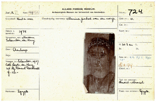 Although the exact provenience, or findspot, of this portrait has been irrevocably lost, consideration of the portrait’s known owners as well as comparative analyses of its composition and historical treatments can allow us to reconstruct a partial biography of the portrait’s history. The portrait is first securely documented in 1907 when it entered the collection of Constant W. Lunsingh Scheurleer under inventory number 724. (The Allard Pierson Museum retained his numbers when he was forced to sell his collection.) As with many other mummy portraits, it had already passed through multiple hands. From Scheurleer’s original records (Figure 3), the Girl with the Golden Wreath can be traced to the collection of the German scholar, art collector and dealer Dr. Carl Reinhardt (1856–1903), who likely acquired it in Cairo, where he served as a diplomat at the Imperial Prussian Consulate.11