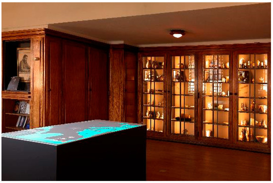 The Collectors’ Cabinet in the Allard Pierson Museum with displays (from far left to right) of Allard Pierson, Jan Six, Flinders Petrie, Friedrich von Bissing and Constant Lunsingh Scheurleer, and an interactive map in front. [Photography by Stephan van der Linden; courtesy of the Allard Pierson Museum].