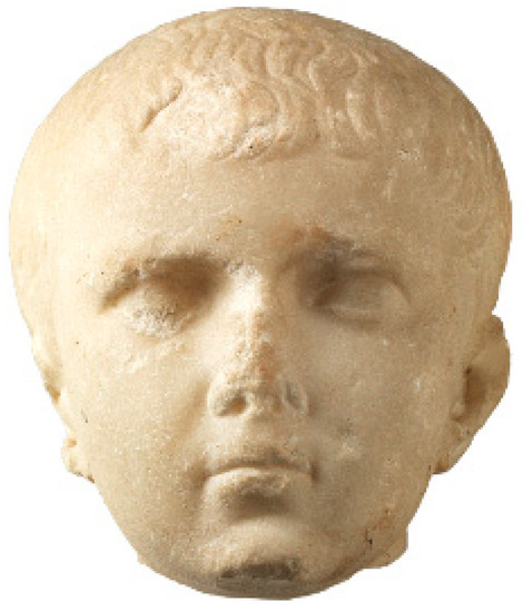 Julian-Claudian Prince Tiberius Gemellus (APM 9350); marble sculpture; Rome (?), Italy; h. 170 mm, ca. 35–40 ce (reign of Tiberius); purchased at art market (Münzen und Medaillen auction 51, Basel, 14–15 March 1975, lot 277); ex Langlotz coll., Würzburg—APM, Amsterdam, 1976. [Photography by Stephan van der Linden; courtesy of the Allard Pierson Museum].