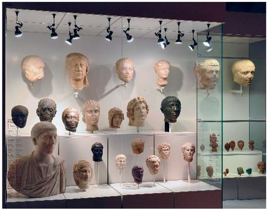The mummy portrait in question is displayed as one of the key objects illustrating the wide variety of physical appearances within the Roman Empire. The girl’s portrait now shares a display case with a small marble portrait head attributed to Tiberius Gemellus (19–37/8 ce; Figure 14)30 and a figurine of a Germanic mother goddess with child (ca. 2nd cent. ce; Figure 15);31 an actual gold-leaf wreath is placed in the case as well.32 Nearby are displays of jewelry (cf. Figure 16),33 a large collection of sculptural portrait heads and busts showcasing different ethnicities from across the Mediterranean (Figure 17), as well as another mummy portrait from the museum’s collection (Figure 18).34 A recently acquired funerary bust of a young woman was purchased for the express purpose of further exhibiting the diversity of appearances within the Roman empire (Figure 19).35
