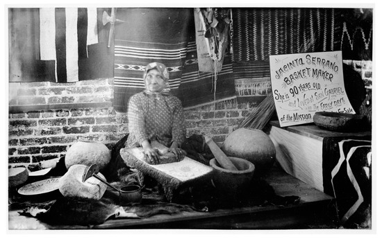 | 15 | “Jacinta Serrano, last San Gabriel Mission Indian basket maker”, The Huntington Library, Art Collections, and Botanical Gardens, https://hdl.huntington.org/digital/collection/p15150coll2/id/3640 (accessed on 4 February 2019). |