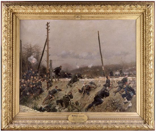 Alphonse de Neuville (1835–1885), Combat sur une voie ferrée; armée de la Loire, 1870–1871, oil on canvas, 172 cm × 216 cm, Chantilly, musée Condé, PE545. Neuville exhibited this painting at the 1874 Salon, with no. 1390. (Used by permission).