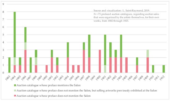 Despite this decline in volume, art critics continued to preface many auction catalogues. The textual analysis of these prefaces also goes against a so-called collapse of the Salon: between 1880 and 1912, half of the prefaces mentioned the Salon des Artistes Français, in order to highlight the careers of artists who sold their works at auction (Figure 5).