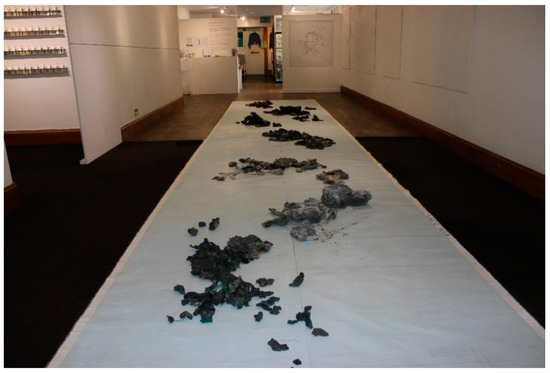 Archipelago, the centrepiece of the Neo Terra exhibition, was a largescale floor-based map featuring ‘islands’ composed of plastiglomerates (Figure 3, Figure 4 and Figure 5). Plastic is burnt, mostly by the fishing industry in Scotland, offshore or onshore, as a means of managing plastic debris. These plastic forms ultimately resemble rock formations, but that appearance belies a very different texture and weight. These lightweight forms were laid out by Barton on a large canvas map with co-ordinates and names written in pencil. The naming of the islands was informed by discussions with school children.