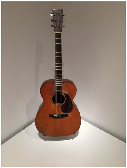 T.C. Cannon’s 000-18 Martin Guitar, as displayed at PEM, T.C. Cannon: At the Edge of America. Photograph by Philip J. Deloria.
