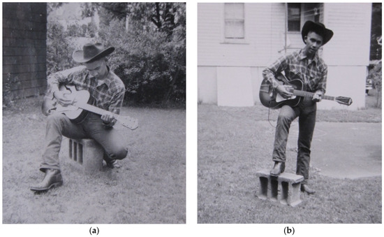 Go back a few years: Cannon is maybe five years old; my dad is 18, and he too has gotten hold of a guitar, learned a few chords, and strolled out into the backyard with a camera, looking to imagine himself, not (yet) as Bob Dylan, but maybe as Gene Autry or Webb Pierce (Figure 2). It looks inexpensive, a western swing instrument with f-holes, perhaps an arch-top electric (is that a pickup under the strings and a cable dangling down?). It’s not clear that my dad is actually playing anything. Perhaps he’s doing a kind of E boogie shuffle pattern as he sits on his cinder block, happy in his hat, boots, and snap shirt? Or standing there with a C-form E7 chord mid-neck? Or am I just being charitable?