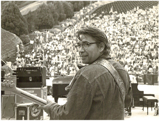 My father’s finest musical moment will come in 1976, as Cannon was painting political pieces like Washington Landscape with Peace Medal Indian or his massive mural, Epochs in Plains History: Mother Earth, Father Sun, The Children Themselves. Through a series of friendships and circumstances, we find ourselves backstage at a Jerry Jeff Walker show at Colorado’s Red Rocks Amphitheater. Half goaded, half encouraged by Walker sideman Gary P. Nunn, my father slips out onstage, dons Jerry Jeff’s Telecaster and grins back over his shoulder, the crowd stacking up behind him (Figure 3). He is reliving his teenage guitar fantasy, and it is not crazy to think that such moments (he hung out with a lot of musicians in the mid-1970s) helped power a change in his own writing, away from his previous political works into his hardest and most complicated book, The Metaphysics of Modern Existence, published in 1979.
