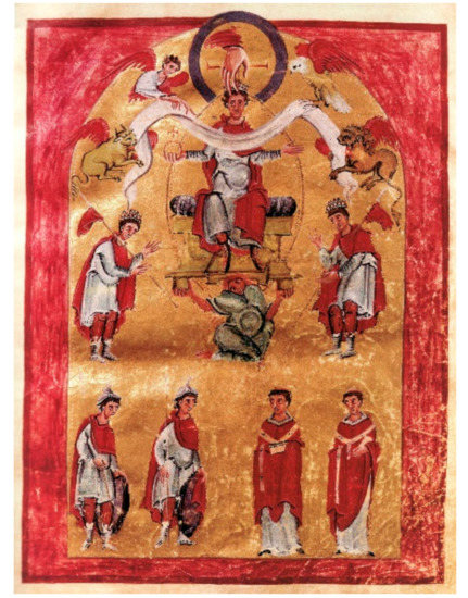 In this type of research, particular attention has been given to the analysis of the iconographic sources12 and, specifically, representations of royalty (above all in the act of being crowned or blessed by Christ or by the Hand of God from the heavens). In particular, historiographers have studied illuminations concerning some Carolingian, Ottonian, and Salian kings, for instance, Charles the Bald in Majesty, illumination, 870. Munich, Bayerische Staatsbibliothek, Clm 14,000, Codex Aureus of St. Emmeram, fol. 5v (Figure 1); Otto III in Glory, illumination, 983–1000. Aachen, Domschatzkammer, Inv. Grimme Nr. 25, Liuthar Gospels, fol. 16r (Figure 2); or Henry II Crowned by Christ, illumination, 1002–1003. Munich, Bayerische Staatsbibliothek, Clm 4456, Sacramentary of Regensburg, fol. 11r (Figure 3).