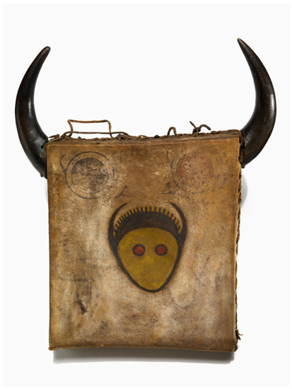 Hand Drum, Attributed to Siyosapa (Hunkpapa/Yanktonai), Collected during the mid-1870s, wood, rawhide, buffalo horn, paint, hide thong, 59 cm × 49 cm × 7 cm. Used by permission of the National Museum of the American Indian, Smithsonian Institution (232202). Photo by NMAI Photo Services.
