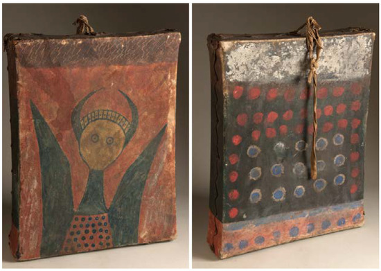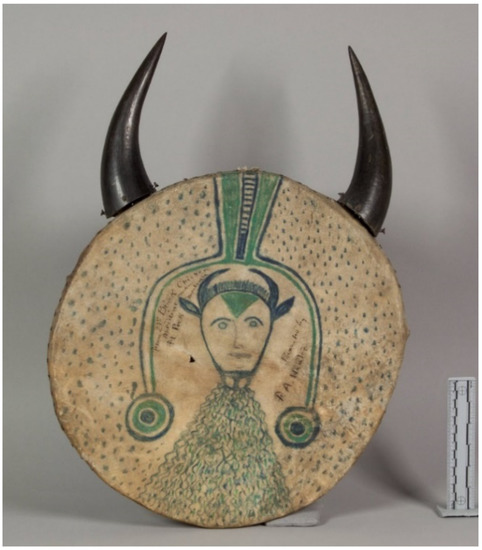 The painting style of the Hunter drum seems a little more cartoonish than the Slocum and Parker square drums, in contrast to their reductive and heavily-outlined faces, but it dates at least a decade later than both of those. The Smithsonian possesses another closely related drum, from a different source, with the same later buffalo head featuring graphic representation of its breath, and buffalo horns attached to the sides (National Museum of Natural History catalogue no. 331537). At least two more drums with buffalo horns and painted buffalo head images have been located in other collections (Hansen et al. 2017, cover; Montana Historical Society, catalogue no. X1982.44.57). A square drum, also dating to the 1890s and in this later style, repeats the design of the horned-and-winged figure on the Parker drum (Latini 2004, p. 28) (Figure 4).