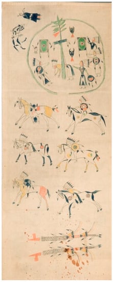 Painting on Muslin, attributed to Siyosapa (Hunkpapa/Yanktonai) Cotton muslin, paint, ink, 90.3 cm × 77 cm. Used by permission of the National Museum of the American Indian (023132). Photo by NMAI Photo Services.