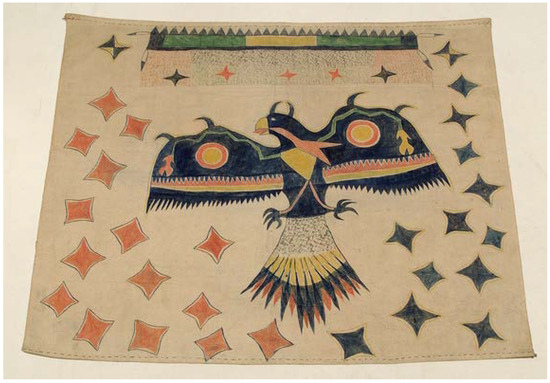 Muslin paintings like Siyosapa’s are often interpreted as a kind of market art or auto-ethnography, to borrow Mary Louise Pratt’s (1992, p. 7) term, produced as records and expressions of historical memory. Culin may have been referring to these and painted hand-drums when he noted that Siyosapa “carried on a lively trade in curios which he made for visitors at the post” (Culin 1901, pp. 171–72). It is tempting to see Siyosapa’s efforts here as primarily entrepreneurial and motivated by concerns for a livelihood and support. Life on the ill-provisioned and criminally administered Fort Peck reservation was, in fact, tenuous and certainly needed for sustenance motivated many to sell precious possessions—or desirable manufactures. However, considering what we can glean about Siyosapa’s world view, his efforts extended beyond simply making items for sale. From collections records we know his creations went to the government agent and clerk, ranking military officers, even the boarding school charged with assimilating Fort Peck children into American society, all-powerful and potentially dangerous agents of authority and control over him and the Fort Peck Yanktonai. The evidence suggests Siyosapa sought out these agents of authority as recipients for significant objects.