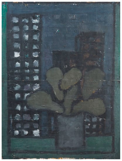 Asim Abu Shakra: Cactus with City in the Background. 1988. Oil on Paper (105 cm × 140 cm). Courtesy Sultan Sooud Al Qassemi.