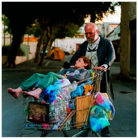 Adi Nes’s 2006 chromogenic print, “Untitled (Abraham and Isaac)” offers the ironic reality of homeless street people in the country created to provide every Jew with a home (Figure 5). The elderly urban street person who pushes his sleeping son in a shopping cart packed with flotsam and jetsam is more akin to Abraham the wanderer than Abraham the founding father of a dramatic new faith, and more akin to the prophet’s diasporic descendants—as Wandering Jews—than to the still-largely rural vision of a century ago in which all Jews coming to the Land would build it and be rebuilt by it. The image would seem to question whether all Jews coming to Eretz Yisrael find themselves well cared for. It might be further noted that Nes (b. 1966), who is openly gay, and whose family is from Iran, has also taken on the particularized regional machismo that characterizes so much of Israeli culture, particularly in staged images involving soldiers.12
